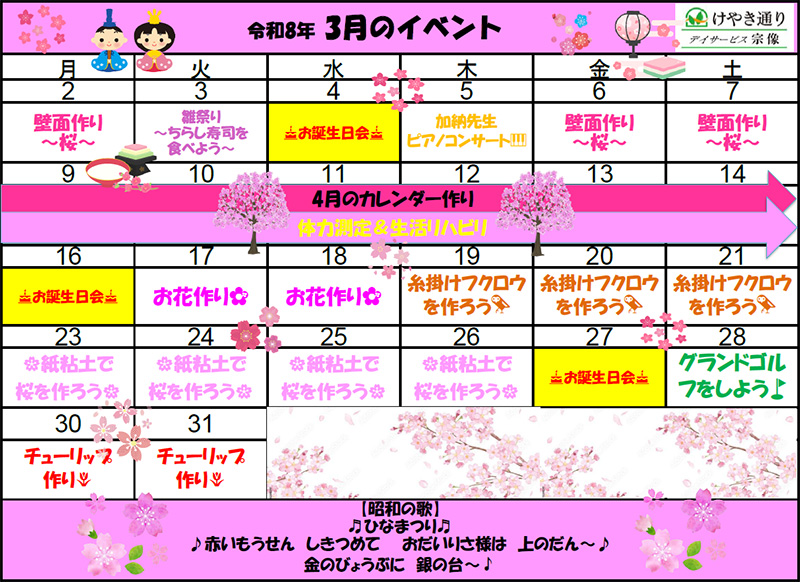 For ケアマネージャー 無料体験利用について 画像をクリックすると拡大し、印刷も可能です。 連載「生活リハビリ通信」 デイサービスけやき通りがどのようなケア&リハをしているかを載せています。 生活リハビリ通信【令和 8年 3月号】 生活リハビリ通信【令和 8年 2月号】 生活リハビリ通信【令和 8年 1月号】 生活リハビリ通信【令和 7年12月号】 生活リハビリ通信【令和 7年11月号】 生活リハビリ通信【令和 7年 9月号】 生活リハビリ通信【令和 7年 8月号】 生活リハビリ通信【令和 7年 7月号】 生活リハビリ通信【令和 7年 6月号】 生活リハビリ通信【令和 7年 5月号】 生活リハビリ通信【令和 7年 4月号】 生活リハビリ通信【令和 7年 3月号】 生活リハビリ通信【令和 7年 2月号】 生活リハビリ通信【令和 7年 1月号】 生活リハビリ通信【令和 6年12月号】 生活リハビリ通信【令和 6年11月号】 生活リハビリ通信【令和 6年10月号】 生活リハビリ通信【令和 6年 9月号】 生活リハビリ通信【令和 6年 8月号】 生活リハビリ通信【令和 6年 7月号】 生活リハビリ通信【令和 6年 6月号】 生活リハビリ通信【令和 6年 5月号】 生活行為向上通信【令和 6年 4月号】 生活行為向上通信【令和 6年 3月号】 生活行為向上通信【令和 6年 2月号】 カレンダー 紙パンフレットデータ 以下の赤いマーク(pdf)をクリックすると、A4の3つ折りパンフレットデータの両面が印刷できます。 2021年1月版 デイサービスけやき通り 運営規定 運営規定